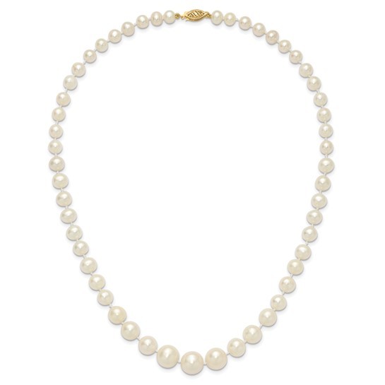 Add a touch of classic sophistication to any ensemble with this exquisite 18-inch pearl necklace. Hand-strung with lustrous white cultured freshwater pearls ranging from 7 to 11 mm, each pearl is carefully selected for its radiant glow and natural beauty. The necklace is finished with a secure and stylish 14k yellow gold pearl clasp. Whether you're dressing for a wedding, gala, or a special night out, this piece makes a refined statement of elegance.